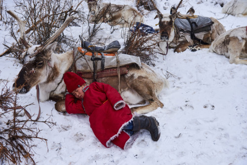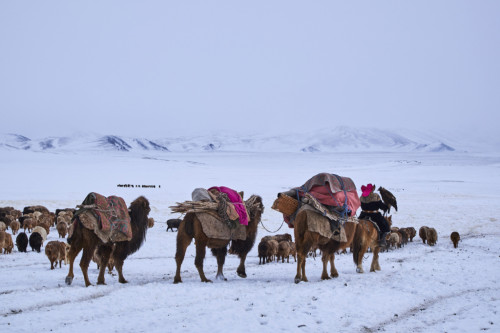 La Mongolie, terre natale de Tuul, est un de leur pays de prédilection où les deux photographes retournent chaque année parcourir les moindres recoins pour garder une trace de ce dernier pays nomade qui fait face à sa façon à la mondialisation. Les pasteurs nomades des steppes mongoles perpétuent une tradition et un mode de vie noble, en harmonie avec la nature environnante depuis des millénaires. Sur cette terre âpre qui a forgé l’homme de la steppe, Tuul et Bruno partent à la rencontre de ses habitants qui vivent au gré des changements saisonniers et des besoins de leurs animaux. Ces pasteurs mènent une existence rude en nomadisant été comme hiver malgré des températures extrêmes, à l’exemple des Tsaatan, ce peuple éleveur de rennes du nord de la Mongolie qui transhument dans la taïga sibérienne par des températures descendant jusqu’à – 30° pour le besoin de leurs animaux.